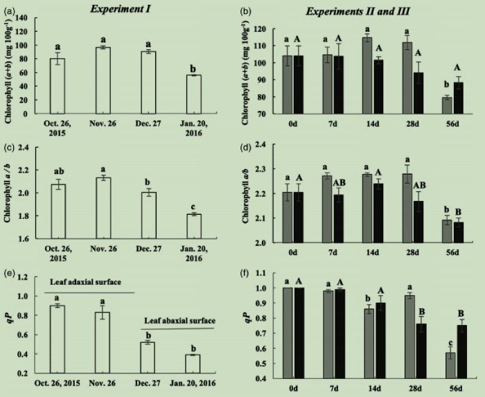 試驗I中葉綠素(a+b)含量從10月26日至1月20日(圖5a)降低了30%(圖5a),試驗II和III在0-56天處理后分別降低了23%和15%(圖5b)。這表明,隨著溫度的降低,葉片試圖通過降低葉綠素含量來降低光吸收。試驗I中,葉綠素a/b在10月26日至1月20日下降了15%(圖5c);試驗II和III中,從0-56天分別減少8%和6%(圖5d)。葉綠素a/b的變化表明試驗I反應(yīng)中心的降解比試驗II和III更嚴(yán)重。代表光系統(tǒng)II反應(yīng)中心開放度的光化學(xué)猝滅(qP)在10月26日至1月20日,降低了57%(圖5e),試驗II和III處理0~56天后,qP分別降低了43%和25%(圖5f)。葉綠素(a+b)、葉綠素a/b和qP在試驗I中下降得更多,說明光保護或光抑制作用更明顯。