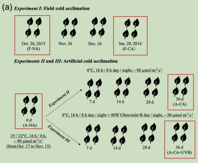 選3年生的“ElsieLee”杜鵑,用于田間或人工低溫馴化試驗,共3組試驗:ExperimentI田間低溫馴化(F-CA),ExperimentII人工低溫馴化(A-CA),ExperimentIII人工用紫外光B進行低溫馴化(A-CA+UVB)。每組試驗36盆,分為3個生物學(xué)重復(fù),每個生物學(xué)重復(fù)12盆,采集當(dāng)年生長的完全展開的葉子進行實驗,葉片在抽樣日期收集后立即在液氮中冷凍,然后-80℃保存。