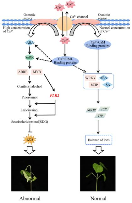 當(dāng)Ca2+從細(xì)胞外或液泡涌入細(xì)胞質(zhì)時(shí),細(xì)胞質(zhì)中的Ca2+濃度會(huì)增加,Ca2+會(huì)與一些Ca2+受體蛋白CaM和CML結(jié)合,形成Ca2+/CaM(CML)結(jié)合蛋白。激活的Ca2+信號(hào)導(dǎo)致一些下游轉(zhuǎn)錄因子的表達(dá)增加,如WRKY和bZIP,通過(guò)調(diào)節(jié)細(xì)胞內(nèi)外水和離子的平衡,細(xì)胞在傳遞Ca2+信號(hào)后可以迅速恢復(fù)到低濃度Ca2+環(huán)境的狀態(tài)。同時(shí),一些激素也受Ca2+信號(hào)的調(diào)節(jié),如ABA和SA,可以緩解棉花中的Ca2+瞬變。當(dāng)植物暴露于高濃度的Ca2+時(shí),它們?cè)僖膊荒艿挚箚为?dú)由通道蛋白引起的大量Ca2+造成的損害。R將通過(guò)ROS清除機(jī)制與通道蛋白形成復(fù)雜的調(diào)節(jié)網(wǎng)絡(luò),共同緩解高Ca2+應(yīng)激。滲透受體感應(yīng)到Ca2+的增加,然后調(diào)節(jié)ABA的合成,激活A(yù)BA信號(hào)通路。首先,增加的ABA與PYL蛋白結(jié)合并與PP2C相互作用,通過(guò)SnRK促進(jìn)一些下游因子的磷酸化,并啟動(dòng)ABA信號(hào)反應(yīng)。此時(shí),編碼PLR2的轉(zhuǎn)錄因子ABRE和MYB被激活。然后,通過(guò)促進(jìn)松脂醇合成落葉松烯醇,落葉松烯醇合成SDG,從而提高活性氧的清除能力,從而增強(qiáng)棉花抵御高Ca2+脅迫的能力(圖4)。