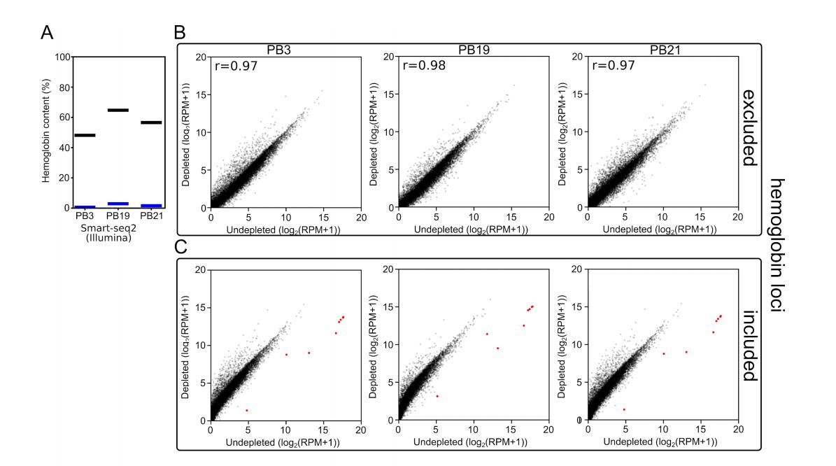 接下來,本研究的目標(biāo)是驗(yàn)證Long-DASH是否真正消耗了cDNA池中的血紅蛋白轉(zhuǎn)錄本,并用Illumina公司的短讀RNA-seq測序平臺(tái)驗(yàn)證。為了說明這一點(diǎn),本研究為每個(gè)去除的和未去除cDNA樣本混池準(zhǔn)備了獨(dú)立的基于Tn5的Smart-seq2文庫。然后,本研究在一個(gè)復(fù)合IlluminaHiSeqx2x151bp運(yùn)行測序Smart-seq2。去除血紅蛋白轉(zhuǎn)錄組本樣本產(chǎn)生了大約2000萬reads,未去除的樣本產(chǎn)生了大約6000萬reads。通過未去除樣本進(jìn)行高深度測序,本研究推斷,在去除樣本和未去除樣本中,非血紅蛋白基因獲得同等的讀取覆蓋率。這使本研究能夠?qū)θコ龢颖竞臀慈コ龢悠愤M(jìn)行并排比較,以確保沒有偏離目標(biāo)的影響。