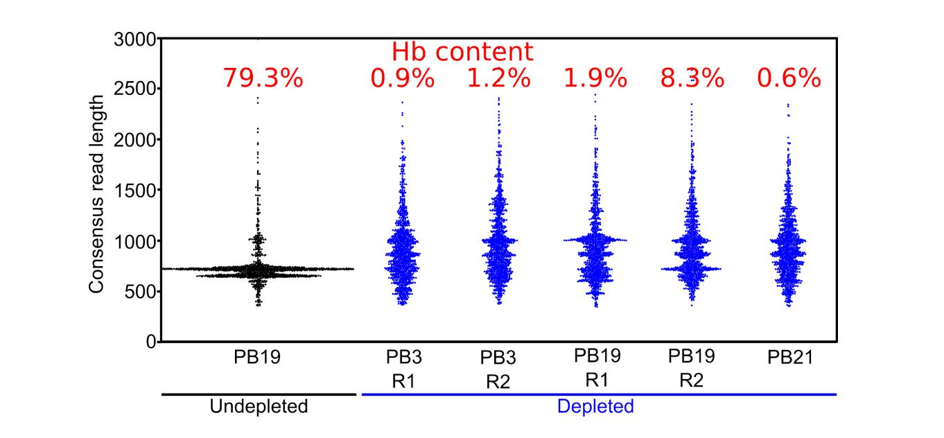 在2%瓊脂糖凝膠上觀察到已去除或未去除的血紅蛋白轉(zhuǎn)錄本cDNA。實(shí)際上,在任何損耗之前,本研究在瓊脂糖凝膠中觀察到位于700-800bp的非常強(qiáng)的條帶,這表明存在大量的HBA和HBB血紅蛋白轉(zhuǎn)錄本(圖2)。經(jīng)過耗盡,再擴(kuò)增和大小選擇,全長cDNA產(chǎn)物再次可視化顯示假定的血紅蛋白條帶的去除(圖2)。在確認(rèn)血紅蛋白耗盡之后,這個(gè)cDNA就可以轉(zhuǎn)換成基于ONT和illumina的文庫,每個(gè)方案都使用相同的cDNA。