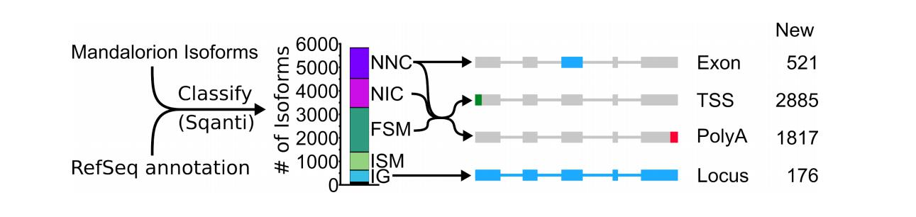 5831個(gè)亞型中的1239個(gè)異構(gòu)體被Mandalorion鑒定為新穎非編目”(NNC),這意味著它們與一個(gè)已知基因重疊,但至少包含一個(gè)未注釋的剪接位點(diǎn)。對(duì)這個(gè)NNC小組的深入分析發(fā)現(xiàn),它們總共包含521個(gè)新外顯子。1301個(gè)亞型被歸類為”目錄中的小說”(novelincatalog,NIC),這意味著它們與一個(gè)已知基因重疊,只使用帶注釋的剪接位點(diǎn),但至少有一次作為以前未注釋的剪接位點(diǎn)的一部分。本研究總共觀察到2540(1239NNC和1301NIC)具有未注釋外顯子構(gòu)型的新異構(gòu)體。總的來說,這個(gè)分析極大地提高了本研究對(duì)全血北極熊轉(zhuǎn)錄組的同型水平的知識(shí)(圖5)。為了使這些知識(shí)能夠直接用于未來的分析,本研究生成了一個(gè)包含了與r2c2/mandalorion異構(gòu)體合并的RefSeqmRNA條目的gtf注釋文件。