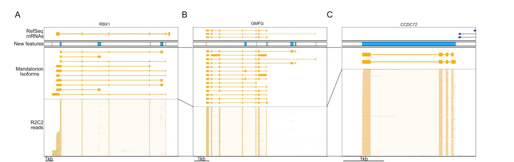 這些新的等形式和等形式特征如何改進(jìn)了現(xiàn)有的注釋可以在下面的三個(gè)例子中清楚地看到。在RBX1基因中,本研究發(fā)現(xiàn)了10個(gè)包含多個(gè)TSSs和polyA位點(diǎn)的新亞型,其中一些與新的末端第一外顯子或末端外顯子有關(guān)(圖6A)。在GMFG基因中,本研究同樣發(fā)現(xiàn)了包含未注釋的內(nèi)部外顯子和末端外顯子、內(nèi)含子保留事件、TSSs和polyA位點(diǎn)的新異構(gòu)體(圖6B)。最后,本研究發(fā)現(xiàn)了一個(gè)新的基因位點(diǎn),該位點(diǎn)包含兩個(gè)亞型,在北極熊RefSeq信使核糖核酸集中完全缺失。然而,將這兩種異構(gòu)體與熊貓基因組(35)對(duì)齊導(dǎo)致了與CCDC72基因的獨(dú)特匹配(圖6C)。