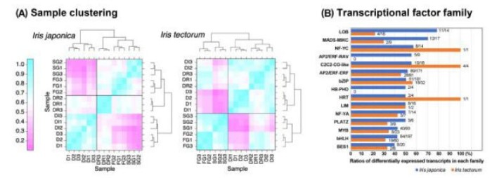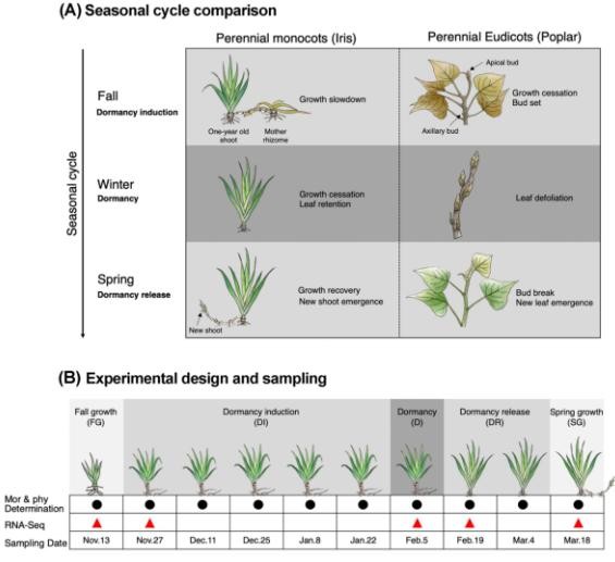 冬季休眠是植物應(yīng)對(duì)潛在致命環(huán)境的最關(guān)鍵策略。近幾十年來(lái),由于氣候的變化,在經(jīng)濟(jì)上具有重要意義的多年生雙子葉植物中的這一過程得到了廣泛的研究。然而,在不需要冷卻的常綠單子葉植物中,休眠過程至今仍是一個(gè)謎。因此,揭示這些單子葉植物越冬休眠的調(diào)控機(jī)制,不僅有助于更好地開發(fā)利用植物資源,而且對(duì)應(yīng)對(duì)全球變暖帶來(lái)的低溫不足的挑戰(zhàn)具有重要意義。通過多年物候觀測(cè)發(fā)現(xiàn),鳶尾和蝴蝶花越冬休眠過程均僅有生態(tài)休眠,將休眠植株移至適宜條件下能迅速恢復(fù)生長(zhǎng),且在同一栽培地區(qū)二者越冬休眠期存在明顯差異,是研究多年生單子葉植物越冬休眠機(jī)理的理想材料。本研究比較了鳶尾(I.tectorum)和蝴蝶花(I.japonica)在關(guān)鍵發(fā)育時(shí)間點(diǎn)的休眠過程。這兩種鳶尾都表現(xiàn)出短暫的休眠過程,且持續(xù)時(shí)間不同,在溫暖條件下都能很容易地恢復(fù)生長(zhǎng)。為了破譯轉(zhuǎn)錄變化,作者對(duì)鳶尾進(jìn)行了全長(zhǎng)測(cè)序,對(duì)蝴蝶花進(jìn)行了RNA-seq測(cè)序,分別生成參考轉(zhuǎn)錄組,揭示了調(diào)控常綠與落葉類鳶尾越冬休眠的分子機(jī)制。