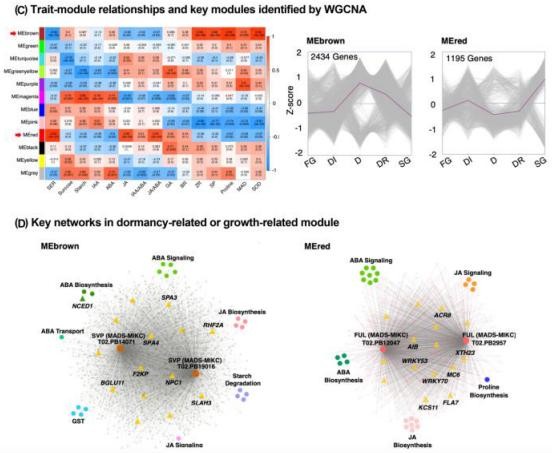 為了了解基因和通路的動(dòng)態(tài)變化,并識(shí)別鳶尾越冬性休眠過程中的休眠相關(guān)模塊,我們對(duì)IJ的所有15118個(gè)差異轉(zhuǎn)錄本進(jìn)行了WGCNA分析,共鑒定出12個(gè)共表達(dá)模塊.對(duì)每個(gè)模塊進(jìn)行了主要的表達(dá)趨勢(shì)和KEGG富集分析。并進(jìn)行模塊-形狀關(guān)聯(lián)分析,選擇形狀特異性模塊和階段特異性模塊。結(jié)果中找到分別與冬季生長(zhǎng)率呈顯著正、負(fù)相關(guān)的生長(zhǎng)模塊(red)和休眠模塊(brown),MADS-box家族基因FUL/AP1和SVP分別位于兩個(gè)模塊,并與植物激素合成與信號(hào)轉(zhuǎn)導(dǎo)、碳水化合物代謝和環(huán)境響應(yīng)通路基因共表達(dá)。