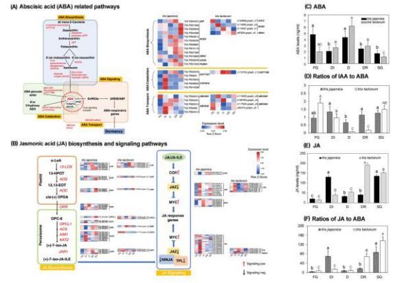 為了進(jìn)一步解剖鳶尾越冬休眠所必需的基因和通路,我們對(duì)基因表達(dá)譜和相關(guān)生理特征進(jìn)行了更詳細(xì)的研究。結(jié)果表明,脫落酸水平在D期升高了兩倍以上,并與SER呈顯著負(fù)相關(guān),表明脫落酸在鳶尾越冬休眠中的保守作用。脫落酸生物合成和分解代謝的穩(wěn)態(tài)jing q調(diào)控植物中的脫落酸水平。相比之下,IJ中參與脫落酸生物合成的差異轉(zhuǎn)錄本在DI過程中保持較低的表達(dá)水平。因此,作者推斷IJ中脫落酸水平的降低比IT中保證了更長(zhǎng)的營(yíng)養(yǎng)生長(zhǎng)周期。推測(cè)這可能是由于脫落酸生物合成的抑制和分解代謝的活躍所致。