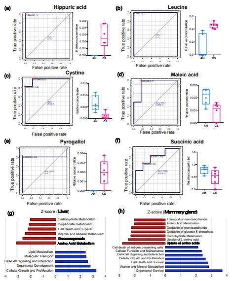 MG中的馬來酸(AUC=0.972,log2FC=-2.88;圖3d),鄰苯三酚(AUC=0.833,log2FC=6.26;圖3e)和琥珀酸(AUC=0.833,log2FC=-3.01;圖3f)是分離AH和CS動物的潛在生物標記。通過IPA識別,CS喂養(yǎng)的奶牛的肝臟中關(guān)鍵顯著下調(diào)的途徑是氨基酸(AA)代謝(P=1.66E-07,Z評分=-3.12),糖異生(P=3.86E-08,Z評分=-2.61))以及肝臟中的維生素和礦物質(zhì)代謝(P=1.47E-15,Z分數(shù)=-2.42)(圖3g);MG中AAs的攝?。≒=1.49E-08,Z分數(shù)=-2.77),攝取L-AA(P=4.52E-07,Z分數(shù)=-2.41),碳水化合物代謝(P=2.10E-11,Z分數(shù)=-2.24)和葡萄糖-6-磷酸的氧化(P=1.01E)-11,Zscore=-2.21)途徑顯著下調(diào)。(圖3h)