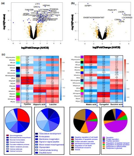 Figue 4. The differential expressed genes between AH and CS groups and coexpressed gene module-biomarker correlation analysis in the liver and mammary gland tissues.