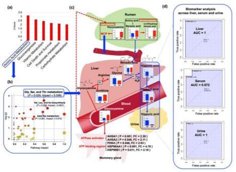 在兩個動物組之間,AA代謝途徑是肝臟中最顯著不同的途徑(圖5a)。對AA代謝途徑的進一步影響分析表明,亞途徑,甘氨酸,絲氨酸和蘇氨酸代謝的影響較大(圖5b,P=0.029,影響值=0.597)。因此,我們對肝臟中與甘氨酸相關(guān)的反應(yīng)進行了徹底的分析,并研究了它們與體內(nèi)體液中代謝物的關(guān)系。綜合比較表明,苯甲酸,糖胺(GAA)和HCA在整個人體的AA代謝中起著關(guān)鍵作用,當母牛飼喂CS時,隨后會影響牛奶的合成(圖5c)。用CS喂養(yǎng)的奶牛肝臟中甘氨酸和HCA的濃度更高,進一步支持了我們的推測,即瘤胃(微生物)和肝臟(宿主)中的苯甲酸代謝都可能受到影響(圖5c)。對肝,血清和尿液進行的HCA生物標志物分析顯示出一致的結(jié)果(圖5d),這進一步表明,從肝臟到尿液的HCA循環(huán)是CS下牛奶產(chǎn)量變化的生物標志物。