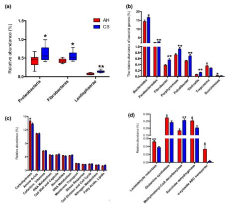 2、根據(jù)宏基因組學,AH組和CS組之間瘤胃微生物組的組成和功能差異