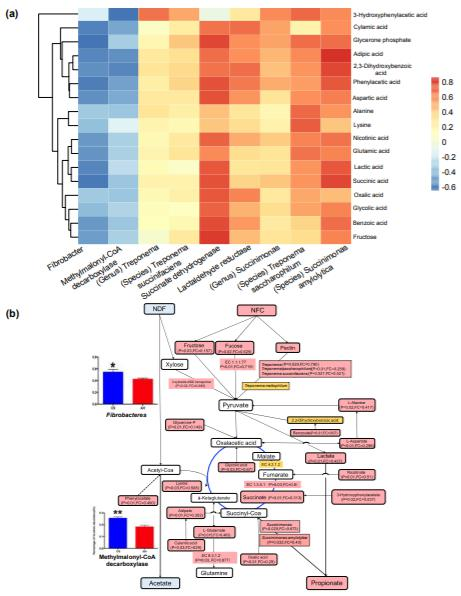 瘤胃液中55種明顯不同的代謝產(chǎn)物中,CS喂養(yǎng)的動物中49種的代謝產(chǎn)物含量較低,通過將微生物分類群相對豐度,碳水化合物代謝中的基因豐度和17種高度豐富的微生物代謝物相關(guān)聯(lián),研究了微生物代謝物與微生物之間的關(guān)系。核心宏基因組相關(guān)元素包括三個細菌屬(纖維桿菌,琥珀酸桿菌和螺旋體)),三種細菌種類(解淀粉琥珀酸桿菌,琥珀酸梅毒螺旋體和嗜糖鏈球菌)和三種微生物功能(甲基丙二酰輔酶A脫羧酶,琥珀酸脫氫酶和乳醛還原酶)(圖2a)。琥珀酸脫氫酶基因和解淀粉鏈球菌的相對豐度分別與16種代謝物(r介于0.43至0.68,P<0.1)和15種代謝物(r介于0.43至0.76,P<0.1)呈正相關(guān)。對上述瘤胃代謝組和代謝組的綜合分析顯示,當給動物喂食CS時,瘤胃中產(chǎn)生較低的丙酸根和較高的乙酸鹽的潛在機理(圖2b)。