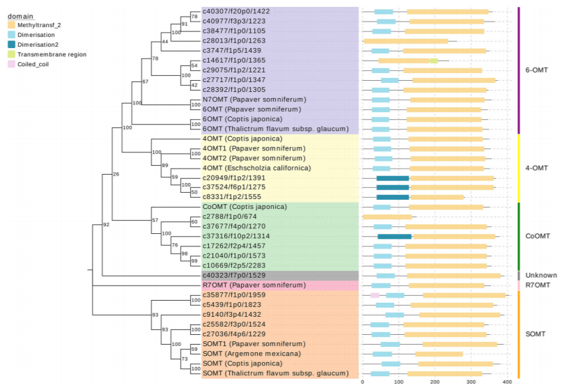 進(jìn)一步研究發(fā)現(xiàn),其中參與合成具有廣泛臨床鎮(zhèn)痛潛力的關(guān)鍵代謝物四氫巴馬汀的酶可能與唯一已知的黃連中負(fù)責(zé)催化這一步反應(yīng)的ColumbamineO-methyltransferase(CoOMT)存在較大的蛋白質(zhì)序列差異。通過系統(tǒng)發(fā)生樹分析,作者們推斷出至少存在10種unigenes的翻譯產(chǎn)物可能催化四氫巴馬汀的合成。 特異性的氧甲基化是四氫巴馬汀與紫堇達(dá)明合成的關(guān)鍵,延胡索中是否存在特殊的一類OMT或者具有不同底物特異性的OMT則是接下來將要重點(diǎn)解析的重點(diǎn)。