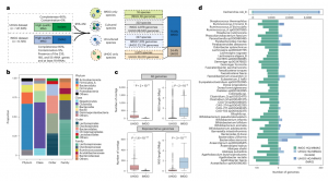 進(jìn)一步深入探索了可用的高質(zhì)量基因組中編碼的代謝潛力。分析了 UHGG 和 IMGG 數(shù)據(jù)集中的高連續(xù)性和高質(zhì)量基因組。共從15512個(gè)基因組中還原了97428個(gè)MGC區(qū)域,其中78675個(gè)是完整的,并被納入進(jìn)一步分析。這些完整的MGC屬于所有八個(gè)MGC類別,分布在58個(gè)MGC類型中。*常見(jiàn)的類別是SCFA(40.0%),其次是Putative(28.9%)和E-MGC(17.2%)。然后,門(mén)水平分布和聚類分析揭示了MGC類別的總體分布在門(mén)水平的顯著差異(圖4a),以及在十個(gè)主要的門(mén)之間,它們?cè)诓煌T(mén)中的數(shù)量各不同(圖4a)。此外,基于涵蓋九個(gè)主要門(mén)的功能性MGC分類分布的特異性聚類表明,MGC概述和組成在門(mén)水平間存在顯著差異,這些未培養(yǎng)物種中的一些最近發(fā)現(xiàn)了以前未報(bào)告的Christensenellales和Oscillospirales分類群,突出了這些代表性不足的分類群在促進(jìn)宿主健康方面的潛力(圖4c)。