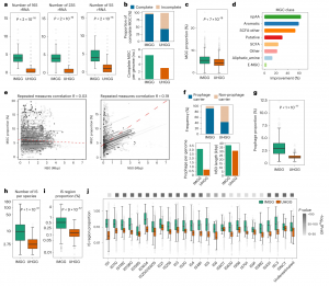 與UHGG數(shù)據(jù)庫(kù)相比,IMGG數(shù)據(jù)庫(kù)中前噬菌體基因組的分辨率有了很大提升。該方法在95%的IMGG中都能檢測(cè)到前噬菌體序列(與UHGG(55%)相比)。IMGG和UHGG每個(gè)基因組編碼前噬菌體的平均數(shù)量分別為4個(gè)和1個(gè)。IMGG中的前噬菌體序列的連續(xù)性也較高,N50長(zhǎng)度為37974 bp(UHGG中為31064 bp;圖3f);IMGG中前噬菌體編碼區(qū)的基因組比例是UHGG的4.2倍(圖3g)。與UHGG相比,IMGG中的IS區(qū)域更加jing q,表現(xiàn)在在每個(gè)物種的IS區(qū)域總拷貝數(shù)(增加了三倍;圖3h)和IS編碼區(qū)域的基因組比例(增加了近四倍;圖3i)。IS類別中改善程度*高的是IS1380(與UHGG相比,改善了5.6倍),其次是IS5、IS1634和ISAS1(分別是5.5倍、5.5倍和5.3倍;圖3j)。