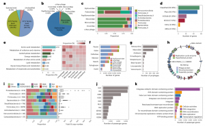 接下來(lái),對(duì)IMGG數(shù)據(jù)庫(kù)中的前噬菌體基因組進(jìn)行深入分析,以探究其功能能力。從12834個(gè)物種水平的vOTU代表性基因組中鑒定出596193個(gè)蛋白質(zhì)編碼基因,并將這些假定基因與幾個(gè)常見(jiàn)的功能和/或病毒注釋數(shù)據(jù)庫(kù)進(jìn)行了比較。結(jié)果表明,僅有55.4%的前噬菌體基因在功能上能夠被分類,而44.6%的基因與任何交叉比較的數(shù)據(jù)庫(kù)都不具有同源性,被分配給了未知的功能(圖5d)。這些結(jié)果表明,盡管攜帶ARG的噬菌體很少存在于腸道微生物中,但這些噬菌體可能編碼ARG(例如,A163.CMAG_1_1_7_59800編碼假定的β-內(nèi)酰胺酶基因;圖5h),可能成為ARG轉(zhuǎn)移的關(guān)鍵載體,并對(duì)人類健康造成嚴(yán)重威脅。這些結(jié)果表明,腸道前噬菌體在分類和功能上比先前我們所了解的更加多樣化。