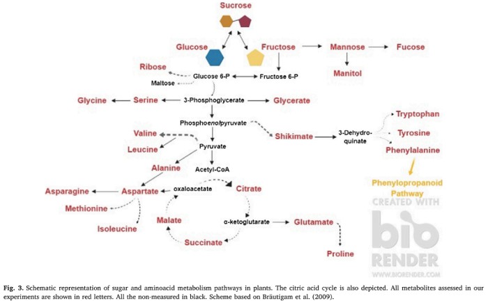 采集“Katerini 53”,“Xanthi 81”和“Smirrni 3B”葉片樣品,并使用氣相色譜GC-MS 和 LC-MS / MS 方法進行代謝分析。基因型預先鑒定為不同的色譜模式,共有 78 種代謝化合物(包括糖,氨基酸,有機酸)差異積累,如圖 3 所示。詳細的非靶向 GC-MS 代謝組學分析用于鑒定煙葉中產(chǎn)生的大多數(shù)主要代謝產(chǎn)物。在本研究中,所測得的最豐富的可溶性糖是果糖,葡萄糖,半乳糖和蔗糖。在果糖和蔗糖中檢測到統(tǒng)計學差異;“Katerini 53”中的果糖含量更高,而“Smierni 3B”中的蔗糖含量更高?!癒aterini 53”與其它兩個品種相比葡萄糖和半乳糖水平較高,差異無統(tǒng)計學意義。在可溶性醇中,兩個豐富的代謝產(chǎn)物是山梨糖醇和肌醇,但在品種之間未檢測到統(tǒng)計學上的顯著差異。這三個品種中的蘋果酸含量沒有任何統(tǒng)計上顯著不同?!癤anthi 81”葉子的氨基酸含量最高,但谷氨酸和 γ-氨基丁酸(GABA)除外。GABA 和脯氨酸是煙葉中的主要氨基酸。與其他兩個品種相比,“Smirrni 3B”中的 GABA 水平明顯更高。’Smirrni 3B’和’Xanthi 81’中的脯氨酸水平較高,而“Katerini 53”的脯氨酸水平最低。在“Smirrni 3B”中檢測到了高濃度的甘氨酸和絲氨酸這兩種必需氨基酸。煙草生物堿在根部合成,然后轉(zhuǎn)運到葉片。生物堿、尼古丁與植物抗草食動物防御有關(guān)。在三個品種中檢測到的尼古丁濃度在統(tǒng)計學上有顯著差異。結(jié)果表明,“Xanthi 81”的尼古丁濃度最高,而“Smirrni 3B”的尼古丁濃度最低。與“Katerini 53”相比,“Xanthi 81”中腐胺的含量有所降低,但其濃度仍高于“Smirrni 3B”。鑒定了所有擬參與煙草中尼古丁生物合成的相應基因,但僅發(fā)現(xiàn)少數(shù)幾個在成熟葉片中表達。然而,基因 XS 和 QPT(三分之二)在“Xanthi 81”中表達較高。與其它兩個品種相比,這與“Xanthi 81”葉片中較高的尼古丁含量相關(guān),這表明它可能是遺傳控制的。