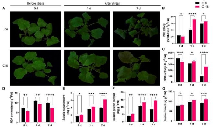 耐寒(C18)和冷敏感(C6)油菜品種在 0 d (CK)、脅迫 1d 和 7d 對冷脅迫(4℃)的生理指標