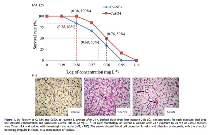 石斑魚被暴露在不同濃度(1.6,1.6,2.4,3.7,5.8或9.0毫克的cu l 1)的cu-np中。這些濃度是根據(jù)初步實驗選擇確定。在暴露期間,魚不被喂食,死魚被移除。急性暴露時間持續(xù)24小時,并在結束時評估魚的死亡率。