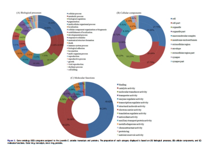 3294個蛋白及11619轉錄本被功能注釋到(圖4)。這些轉錄本和蛋白質(zhì)分別分布在25和24個COG類別中,其中“僅一般功能預測”是轉錄本的較大組(總共1732個)和蛋白質(zhì)(630),之后是“信號轉導機制”,“翻譯后修飾、蛋白質(zhì)翻轉、伴侶”、“功能未知”、“轉錄”、“細胞內(nèi)轉運、分泌和囊泡轉運”、“細胞骨架”和“RNA加工和修飾”。在“脂質(zhì)轉運和代謝”這類中轉錄本3.2%(總共372個)和蛋白質(zhì)4.6%(153)