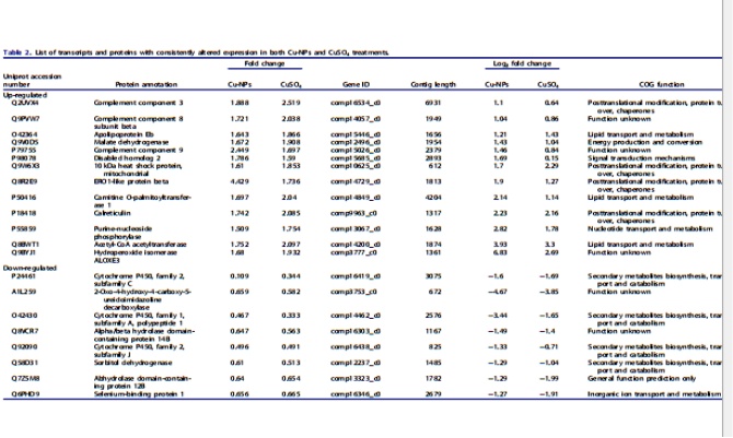 用蛋白質(zhì)組學分析方法獲得的差異表達蛋白與mRNA進行了比較分析;根據(jù)他們的氨基酸序列來匹配轉錄本,在Cu-NPs組與對照組及CuSO4和對照組相比較,分別共140(100%)和352(99.4%)個差異表達的蛋白。我們進一步確定在兩種銅粒子下蛋白和基因的表達是否一致,發(fā)現(xiàn)21的轉錄和蛋白在同一方向改變(13個上調(diào),八個下調(diào))(表2)。有趣的是,大多數(shù)基因(16個基因)的表達在Cu-NPS比CuSO4更強烈,但是蛋白質(zhì)卻相反。