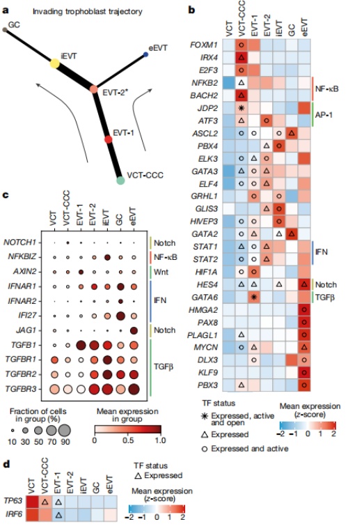 a.PTOs比TSCs更好地體現(xiàn)VCT的異質(zhì)性。b.在PTOs中存在體內(nèi)定義的四個(gè)VCT亞群,,它們表達(dá)相同的典型標(biāo)志物。c.在PTO中,VCT-CCC在EVTM存在下富集,觸發(fā) FOXM1–NOTCH1 軸 NF-κB (NFKB2和BACH2)和AP-1調(diào)制器(JDP2和ATF3),相比之下,在TSC中找不到真正的VCT。D.在TSC和PTO中,VCT-CCC(CDH5,ITGB6和LCAT1)在EVTM培養(yǎng)基存在下富集,從而觸發(fā)NOTCH–FOXM1軸,導(dǎo)致 IRF6 進(jìn)一步下調(diào)和 EVT-1 中的 TP6323。