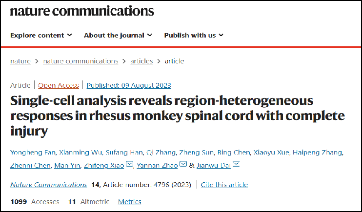作者通過對構建的胸段全橫斷脊髓損傷恒河猴模型進行了單細胞轉錄組測序,深入解析了完全性脊髓損傷近端和遠端不同區(qū)域的細胞動態(tài)變化。并進一步研究了膠原材料支架移植對完全性脊髓損傷不同區(qū)域的治療效應和機制。