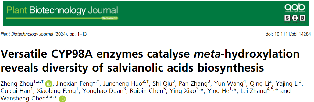 2024年1月16日,海軍軍醫(yī)大學(xué)陳萬(wàn)生與張磊團(tuán)隊(duì)合作在植物學(xué)領(lǐng)域國(guó)際一流學(xué)術(shù)期刊《植物生物技術(shù)》Plant Biotechnology Journal發(fā)表一項(xiàng)最新研究成果,題為:Versatile CYP98A enzymes catalyse meta-hydroxylation reveals diversity of salvianolic acids biosynthesis。本研究以富含丹酚酸的代表性重要藥用植物丹參為研究對(duì)象,闡明了丹酚酸生物合成的多樣性,為CYP98A酶在間位羥基化反應(yīng)中催化特異性的通用性提供了新的見(jiàn)解,同時(shí)也證明CYP98A酶是利用代謝工程策略提高丹酚酸含量的理想操作靶點(diǎn)。中藥丹參為唇形科鼠尾草屬植物丹參(Salvia miltiorrhiza Bge.)的干燥根和根莖,是我國(guó)常用中藥。丹參藥用歷史悠久,始載于中國(guó)傳統(tǒng)醫(yī)藥學(xué)典籍《神農(nóng)本草經(jīng)》,具有祛疲止痛、活血通經(jīng)、清心除煩之功效。丹參作為復(fù)方丹參滴丸、復(fù)方丹參片、丹紅注射液等藥物的原料,廣泛應(yīng)用于心、腦血管疾病的治療,丹參藥材的年使用量超萬(wàn)噸,屬于大宗常用中藥材。丹參有效成分主要包括脂溶性的丹參酮類(lèi)化合物和水溶性的丹酚酸類(lèi)化合物。