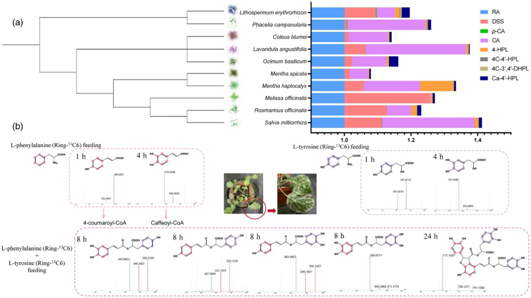 丹參中酪氨酸衍生的途徑從未被報(bào)道過(guò),丹參素(DSS)是否參與SA生物合成仍然未知。SA的生物合成可能是多樣化的,作者在同位素標(biāo)記的喂養(yǎng)實(shí)驗(yàn)去驗(yàn)證這一結(jié)論。含有同位素標(biāo)記的 L-苯丙氨酸和 L-酪氨酸浸潤(rùn)3個(gè)月大的丹參葉子中。從不同時(shí)間點(diǎn)收集的葉片中提取SA,并使用UPLC-Q-TOF/MS進(jìn)行分析。結(jié)果顯示,在p-CA、CA、4-HPL、DSS、SAB和RA及其前體(包括4C-4′-HPL、4C-3′、4′-DHPL和Ca-4′-HPL)均被檢測(cè)出標(biāo)記(圖1b)。這些結(jié)果驗(yàn)證了作者的推測(cè),即不同的?;w,包括4C-CoA和CA-CoA以及含有4-HPL和DSS的?;荏w參與SA的形成。SA的生物合成途徑是多種多樣的。