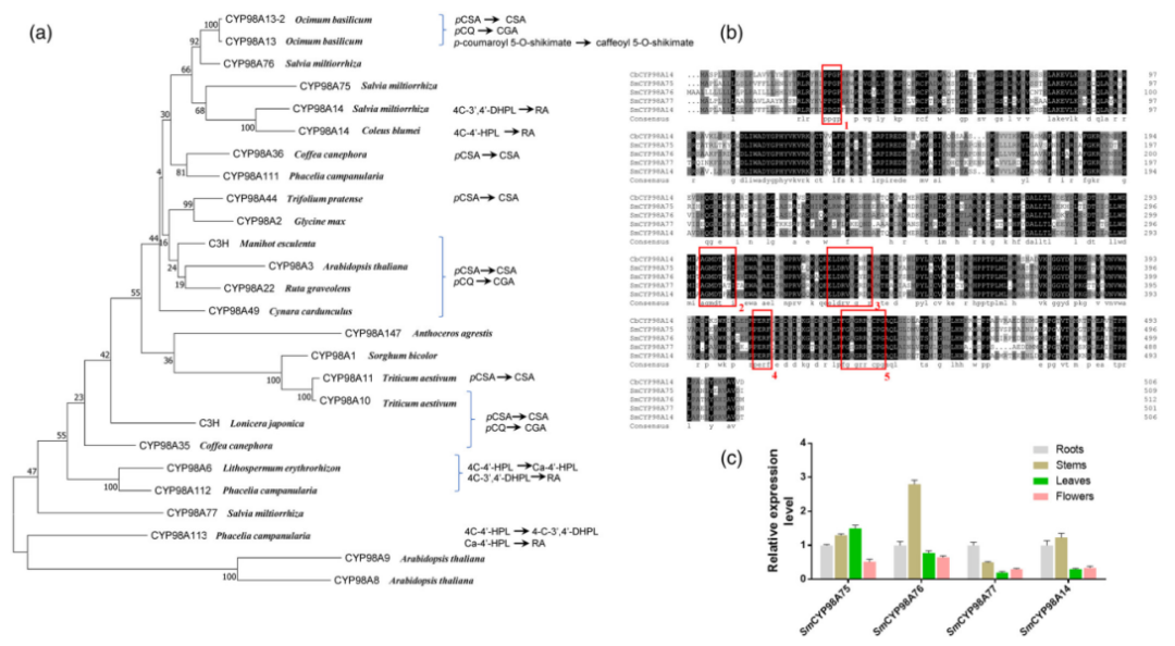 從SmCYP98A亞家族中鑒定出4種酶,分別是SmCYP98A75、SmCYP98A76、SmCYP98A77和SmCYP98A14。SmCYP98A家族酶能催化羥基肉桂酸酯的間羥基化形成RA,說(shuō)明它們屬于4-香豆酰酯3-羥化酶(C3H)家族。通過(guò)鄰連接樹(shù)(NJ樹(shù))分析,SmCYP98A酶與C3H之間的系統(tǒng)發(fā)育關(guān)系(圖2a)。結(jié)果表明,SmCYP98A75與SmCYP98A14和CbCYP98A14具有更顯著的序列同源性。而SmCYP98A77與其他CYP98A成員同源性較低。四種SmCYP98A 酶的氨基酸序列包含 P450 單加氧酶的幾個(gè)特征基序,例如 PERF 基序、血紅素結(jié)合半胱氨酸基序和含蘇氨酸的結(jié)合口袋(圖2b)。