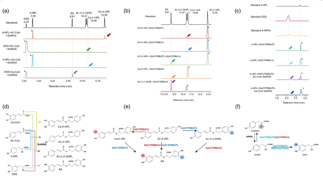 上述研究表明SmCYP98A75負(fù)責(zé)RA生物合成中酰基受體部分的 C-3′羥基化,因此作者推測(cè)SmCYP98A 酶可能在丹參素DSS形成中發(fā)揮重要作用。體外酶活實(shí)驗(yàn)表明,當(dāng)SmCYP98A75或SmCYP98A14與4-HPL一起孵育時(shí),在產(chǎn)物中檢測(cè)到4-HPPA,說(shuō)明這兩種酶表現(xiàn)出將4-HPL的側(cè)鏈羥基直接氧化為酮的能力。然而,在兩個(gè)反應(yīng)系統(tǒng)中均未檢測(cè)到DSS。作者認(rèn)為植物內(nèi)部生物合成環(huán)境是復(fù)雜的,包括許多代謝途徑和催化酶,在反應(yīng)體系中加入?;w和SmRAS,以模擬丹參的DSS生物合成。與SmRAS和4C-CoA或Ca-CoA孵育后,僅在SmCYP98A75催化的反應(yīng)中產(chǎn)生DSS(圖3c,f)。