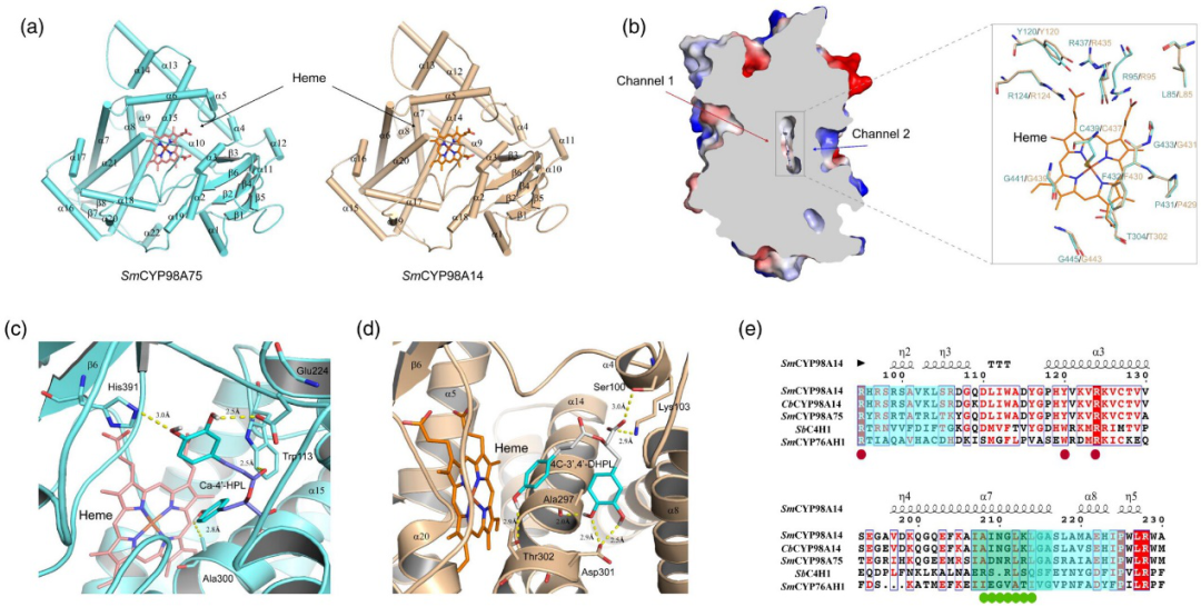 SmCYP98A75和SmCYP9814底物特異性的差異為研究底物識(shí)別和代謝的結(jié)構(gòu)特征提供了機(jī)會(huì)。使用在線SWISS-MODEL進(jìn)行同源建模。SmCYP98A75和SmCYP98A14的整體結(jié)構(gòu)模型高度相似,表明兩種SmCYP98A的底物識(shí)別和代謝是保守的。SmCYP98A75的整體結(jié)構(gòu)模型包含22個(gè)α螺旋和8個(gè)β鏈,SmCYP98A14的整體結(jié)構(gòu)模型包含20個(gè)α螺旋和6個(gè)β鏈,與 SmCYP98A14 高度相似(圖5a)。在結(jié)構(gòu)模型中觀察到血紅素分子與兩個(gè) SmCYP98A 的活性結(jié)合口袋。通過(guò)與口袋內(nèi)殘基的多次相互作用,它被穩(wěn)定在正確的位置。兩種SmCYP98A和CbCYP98A14的血紅素包圍基序和關(guān)鍵催化氨基酸是高度保守的(圖5b)?;谂c已知 P450 的疊加,通道 1 可能容納底物進(jìn)入和產(chǎn)物,而通道 2 可能使血紅素能夠進(jìn)入水和質(zhì)子。