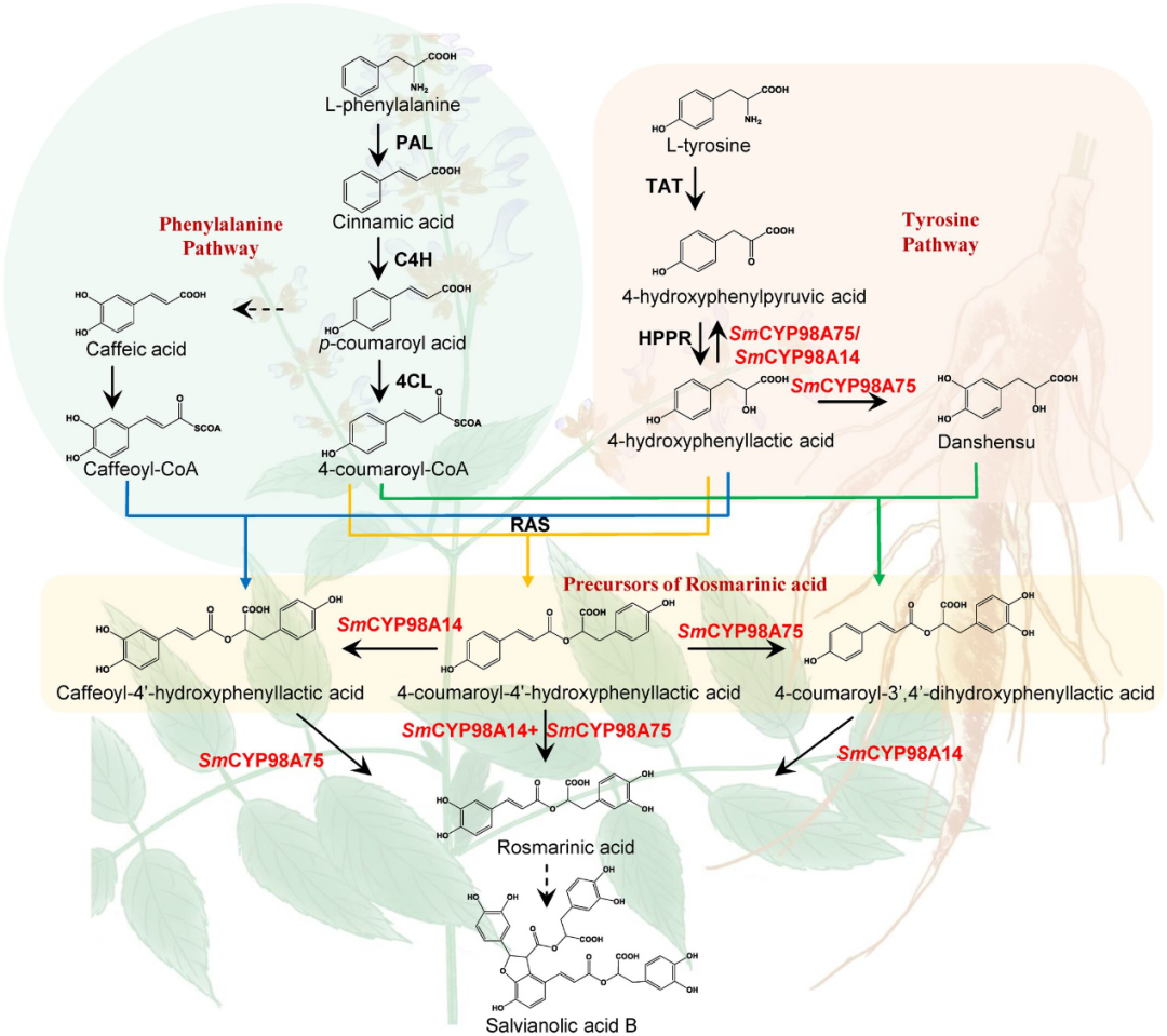 在多種食品和醫(yī)療行業(yè)應(yīng)用中顯示出巨大的潛力,這推動(dòng)了全球?qū)A一代的關(guān)注。SA的生物合成途徑已在多個(gè)物種中報(bào)道,幾乎所有研究都認(rèn)為只有一個(gè)?;w和受體參與SA的形成。本研究研究強(qiáng)調(diào),各種?;w和受體參與酯形成反應(yīng),CYP98A酶負(fù)責(zé)SA生物合成中的不同間羥基化。在這里,以S. miltiorrhiza為例,闡明SA生物合成的多樣性(圖6)。這些研究大大加深了對(duì)酚酸生物合成途徑中SA的理解,并增強(qiáng)了我們克服具有多種藥理活性的工程復(fù)合SA的合成生物學(xué)挑戰(zhàn)的能力。