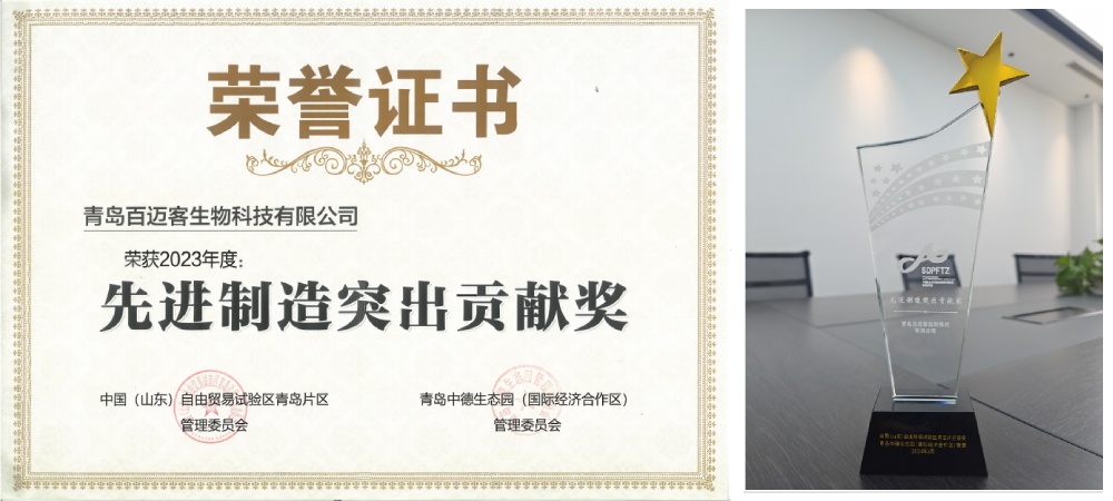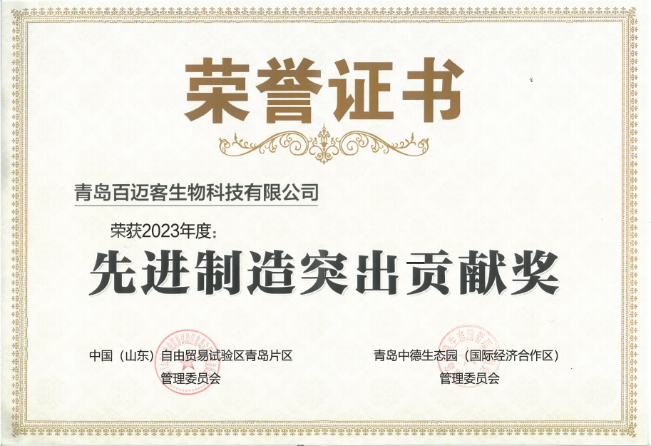 近日,中國(山東)自由貿(mào)易試驗區(qū)青島片區(qū)管理委員會組織開展了2023年度“先進制造突出貢獻獎”“常青藤企業(yè)獎”等九個獎項評選,旨在大力弘揚企業(yè)家精神,激發(fā)企業(yè)和企業(yè)家的創(chuàng)業(yè)熱情,推動先進制造業(yè)發(fā)展。百邁客生物從眾多企業(yè)中脫穎而出,榮獲“2023年度先進制造突出貢獻獎“。