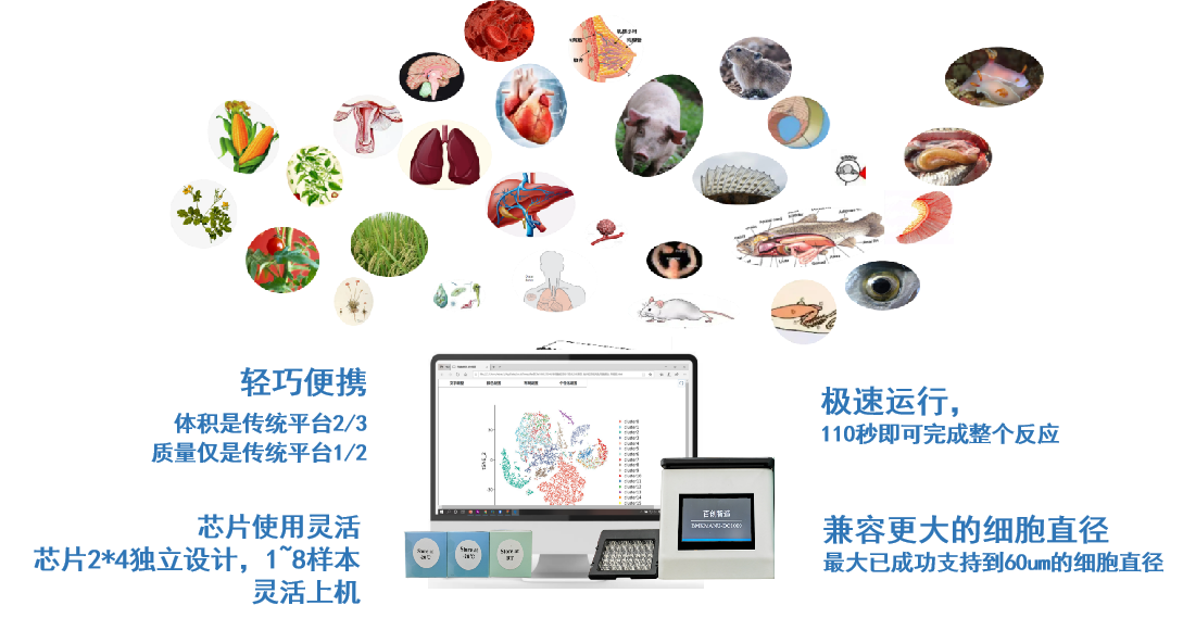 百創(chuàng)智造自主研發(fā)的單細胞平臺–百創(chuàng)DG1000,是基于微流控、油滴包裹和Barcode標記等技術來實現(xiàn)高通量的細胞捕獲。除了儀器以外,百創(chuàng)DG1000還有配套的2×4的獨立芯片、GEM形成試劑盒、純化試劑盒、以及建庫試劑盒。