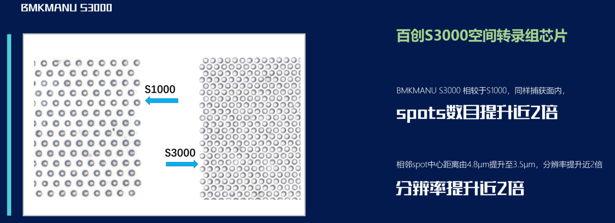 相較于現(xiàn)在廣受市場認(rèn)可與好評的百創(chuàng)S1000轉(zhuǎn)錄組芯片,捕獲位點(diǎn)數(shù)提升近2倍,分辨率同樣提升近2倍