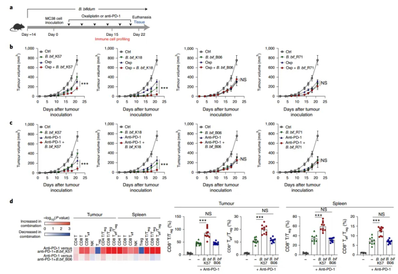圖3-雙歧桿菌菌株聯(lián)合奧沙利鉑或抗pd-1在同基因小鼠腫瘤模型中的協(xié)同抗腫瘤作用