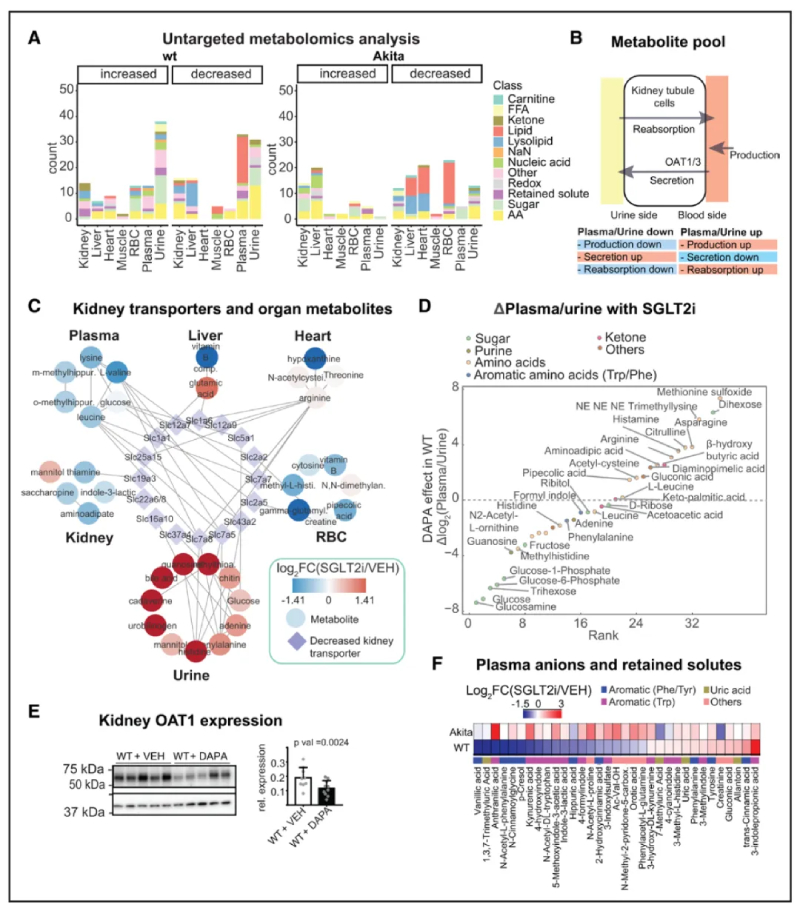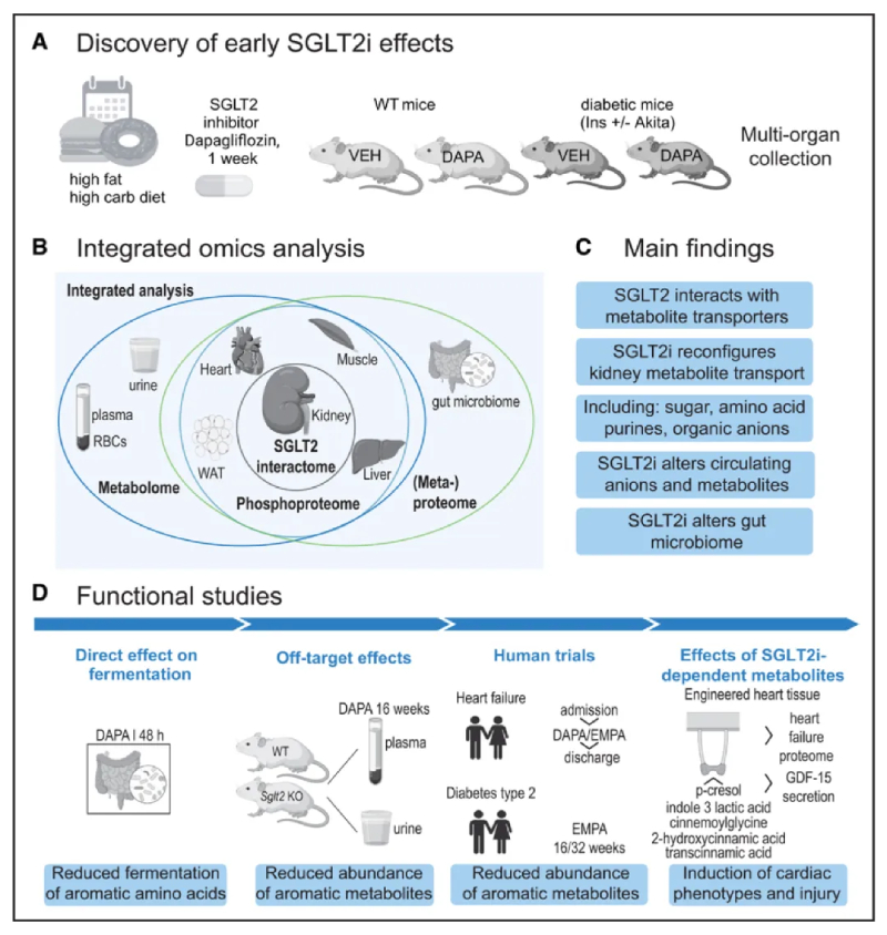 丹麥奧胡斯大學(xué)學(xué)者在Circulation雜志上發(fā)表題為“Metabolic Communication by SGLT2 Inhibition“研究論文,研究團(tuán)隊(duì)使用Akita小鼠模型和臨床隊(duì)列樣品,通過(guò)整合宏基因組、代謝組、蛋白組等多組學(xué)數(shù)據(jù),確定了SGLT2i對(duì)腎臟、心臟、血管和其他器官的幾種SGLT2依賴(lài)性效應(yīng)和脫靶效應(yīng),通過(guò)重構(gòu)腎臟代謝物轉(zhuǎn)運(yùn)和全身代謝通訊,發(fā)揮心腎保護(hù)作用。提供了關(guān)于SGLT2相互作用因子和SGLT2i依賴(lài)性蛋白質(zhì)組、代謝組、磷酸化蛋白質(zhì)組和宏蛋白質(zhì)組的新見(jiàn)解,從而為SGLT2i新型和早期機(jī)制靶標(biāo)提供了潛在的路線,促進(jìn)代謝藥物的開(kāi)發(fā)。