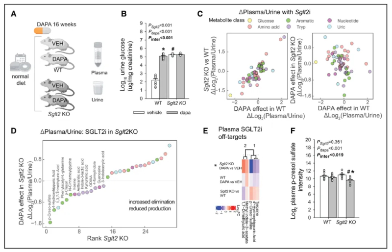 在SGLT2 KO和WT小鼠中,許多代謝物的比率發(fā)生了類(lèi)似的變化,就像在WT小鼠中使用達(dá)格列凈和溶劑處理一樣(圖5C左圖),這表明SGLT2抑制的后果。在其他方面,葡萄糖比率的下降,反映了尿糖排泄的增加。正如預(yù)期的那樣,SGLT2的缺失阻斷了達(dá)格列凈對(duì)葡萄糖排泄的影響(圖5C右圖)。另一方面,達(dá)格列凈顯著改變了SGLT2 KO小鼠體內(nèi)許多代謝物的比例,表明了一種偏離靶點(diǎn)的效應(yīng)(圖5D)。血漿:尿液比例的排名變化顯示,達(dá)格列凈降低了SGLT2 KO小鼠中多種芳香酸代謝物的比例,包括甲酚和馬尿酸鹽,其次是色氨酸代謝物。血漿水平分析確定了SGLT2i在SGLT2 KO環(huán)境中顯著改變的5種代謝物,包括PCL硫酸鹽和一種修飾的馬尿酸(圖5E和5F)。該實(shí)驗(yàn)表明SGLT2i治療具有非靶點(diǎn)效應(yīng),包括對(duì)甲酚、馬尿酸鹽和色氨酸代謝物。