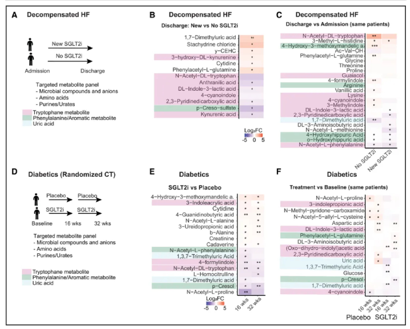 鑒于腎臟SGLT2相互作用組以及微生物對(duì)SGLT2i的反應(yīng)在小鼠和人類(lèi)中相似,我們想知道SGLT2i是否會(huì)影響循環(huán)中的溶質(zhì),在縱向數(shù)據(jù)中與心血管相關(guān)。對(duì)來(lái)自2個(gè)獨(dú)立研究的患者的血漿樣本進(jìn)行了靶向代謝組分析,目標(biāo)是80個(gè)有機(jī)陰離子和尿毒癥毒素。在第一組>40名患者中,在失代償性心衰的真實(shí)環(huán)境中分析了這種影響(圖6A)。結(jié)果表明,SGLT2i顯著降低或鈍化了心力衰竭患者血漿中幾種有機(jī)陰離子的增加,但僅當(dāng)住院期間添加SGLT2i時(shí)(圖6B和6C)。包括幾種色氨酸代謝物,如ILA、犬尿酸和乙酰色氨酸,以及苯丙氨酸代謝物苯乙酰谷氨酰胺和PCL硫酸鹽。分析了在糖尿病患者中使用SGLT2I(依帕列凈)的隨機(jī)對(duì)照試驗(yàn)的縱向數(shù)據(jù)(圖6D)。與基線和安慰劑相比,二甲基尿酸和三甲基尿酸的血漿濃度降低,PCL降低,吲哚代謝物增加緩慢(圖6E和6F)。在兩項(xiàng)臨床研究中,降低的溶質(zhì)大部分來(lái)自嘌呤代謝和腸道芳香氨基酸代謝,這與在小鼠身上觀察到的代謝器官一致。