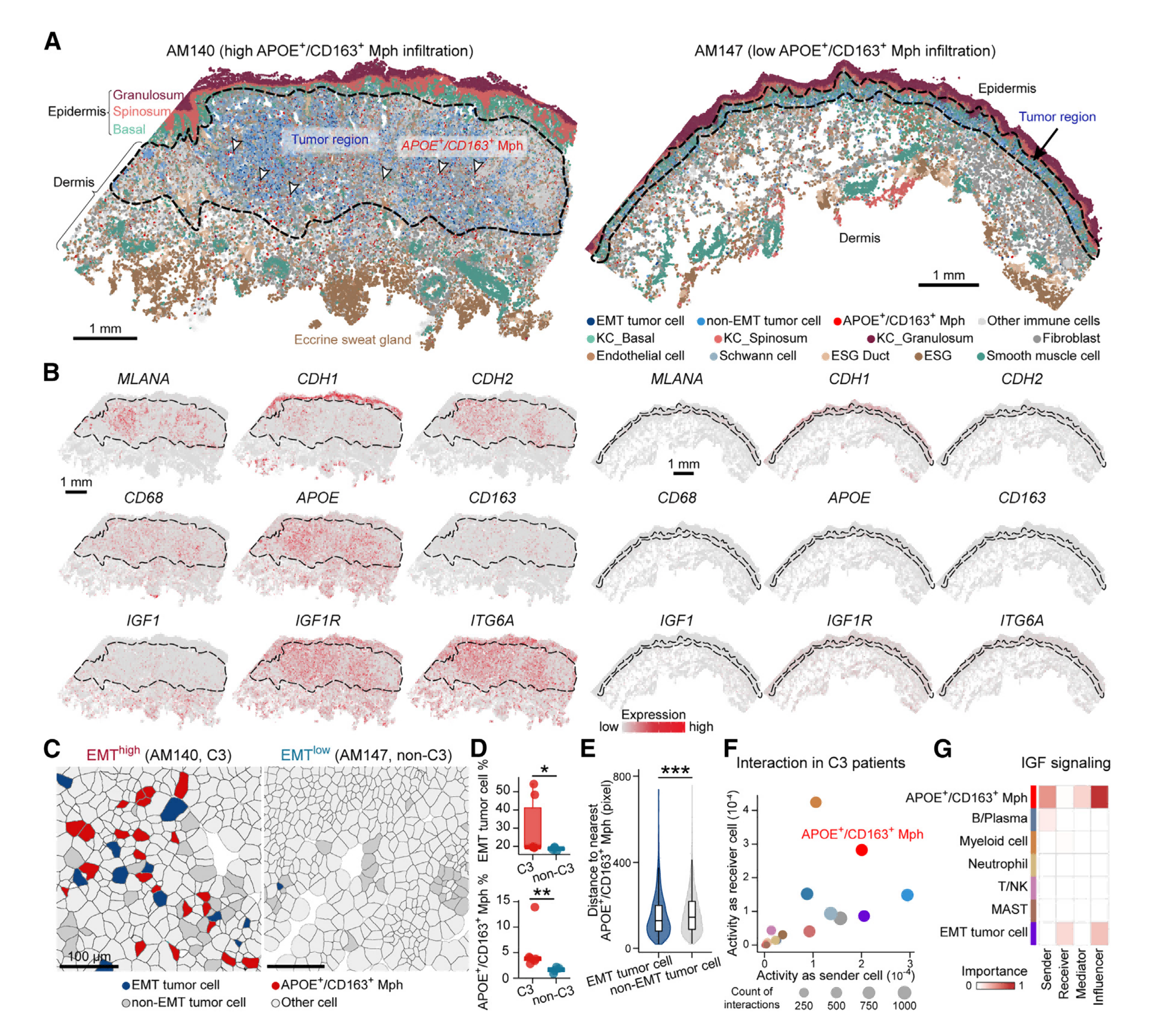 為了探索APOE+/CD163+ TAM與EMT高水平的腫瘤細(xì)胞相關(guān)作用,通過(guò)空間轉(zhuǎn)錄組測(cè)序技術(shù)(ST,BMKMANU S1000)檢測(cè)10個(gè)AM樣品。結(jié)果可清晰觀察到腫瘤組織多層結(jié)構(gòu),包括表皮層:基層、棘層和顆粒層、以及分泌汗腺的皮下結(jié)構(gòu)和血管。在C3 iAM患者中,腫瘤區(qū)域富集大量的EMT高水平的腫瘤細(xì)胞,同時(shí)也高度浸潤(rùn)了APOE+/CD163+ TAM,而在非C3患者中無(wú)法發(fā)現(xiàn)這種共存。正如預(yù)期的那樣,C3患者表現(xiàn)出EMT腫瘤細(xì)胞比例明顯較高,并且APOE+/CD163+ TAM水平增高。C3患者中,在空間位置上APOE+/CD163+ TAM更接近EMT腫瘤細(xì)胞。CellChat分析顯示APOE+/CD163+ TAM作為信號(hào)發(fā)送者(配體)和接收著(受體)均表現(xiàn)出高活性,證實(shí)了其具有細(xì)胞與細(xì)胞強(qiáng)互作。與其他免疫細(xì)胞相比,APOE+/CD163+ TAM表現(xiàn)出最高水平的胰島素生長(zhǎng)因子(IGF)信號(hào)網(wǎng)絡(luò)的發(fā)送細(xì)胞和接收細(xì)胞,這些結(jié)果揭示APOE+/CD163+ TAM和EMT腫瘤細(xì)胞在空間上的直接接觸和密切相互作用。