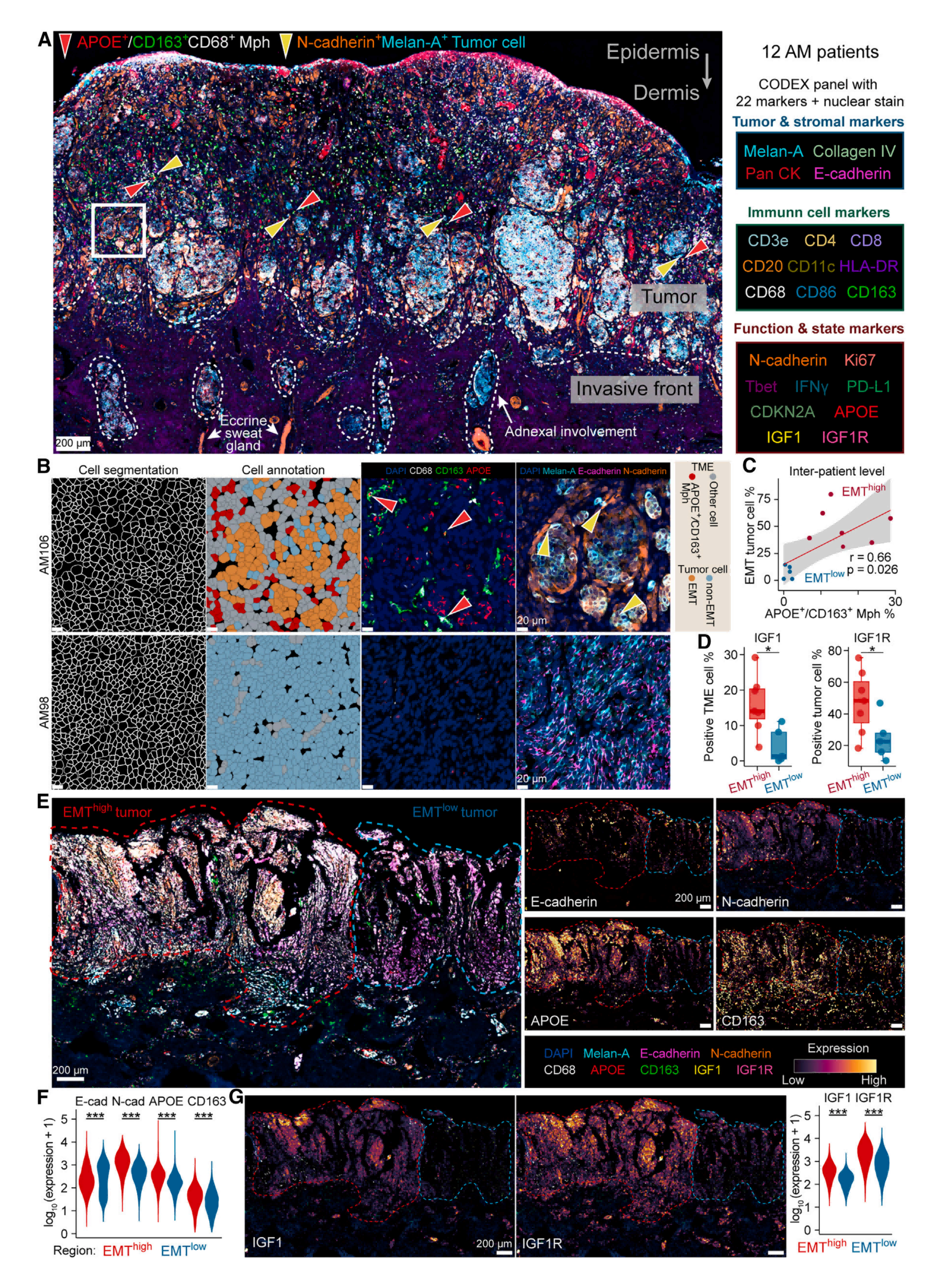 進(jìn)一步驗(yàn)證APOE+/CD163+?TAM和EMT腫瘤細(xì)胞在蛋白水平上的空間分布和相互作用,文中對(duì)12個(gè)AM樣本進(jìn)行了空間蛋白組檢測(cè)(22 plex CODEX)。其中C3患者以EMT腫瘤區(qū)域?yàn)橹鳎荂3患者以非EMT腫瘤區(qū)域?yàn)橹?,結(jié)果表明APOE+/CD163+ TAM與EMT腫瘤細(xì)胞呈正相關(guān)。在C3患者中,IGF1和IGF1R的表達(dá)水平均顯著升高。APOE+/CD163+ TAM高度富集在EMThigh區(qū)域。同時(shí)IGF1和IGF1R在EMThigh區(qū)域也顯著升高。這些結(jié)果在單細(xì)胞水平和空間水平均支持APOE+/CD163+?TAM可能通過(guò)IGF1-IGF1R相互作用促進(jìn)腫瘤細(xì)胞的EMT。