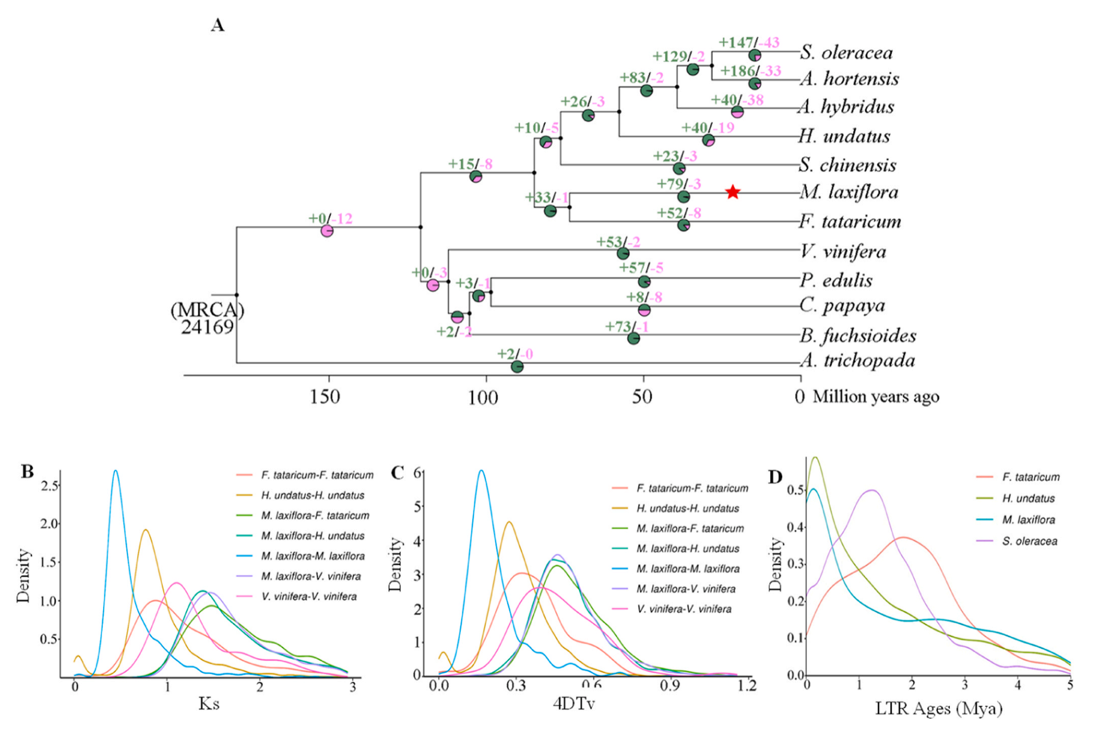 比較基因組研究發(fā)現疏花水柏枝與苦蕎(F. tataricum)的親緣關系最為密切,大約在65-81百萬年前(Mya)發(fā)生分化;在19.74 ~ 24.60 Mya之間發(fā)生了一次全基因組復制(WGD), 4dTV分析證實了這一點。在0.15 Mya左右存在一個長末端重復(LTR)插入。這些基因組變化可能與疏花水柏枝在進化過程中所經歷的環(huán)境劇變(如青藏高原隆升)有關?;蚣易宸治鲲@示疏花水柏枝的特有基因家族與能量代謝和信號轉導密切相關;85個基因在疏花水柏枝基因組中經歷了正選擇,這些基因在與氨基酸合成和代謝相關的KEGG通路中顯著富集。