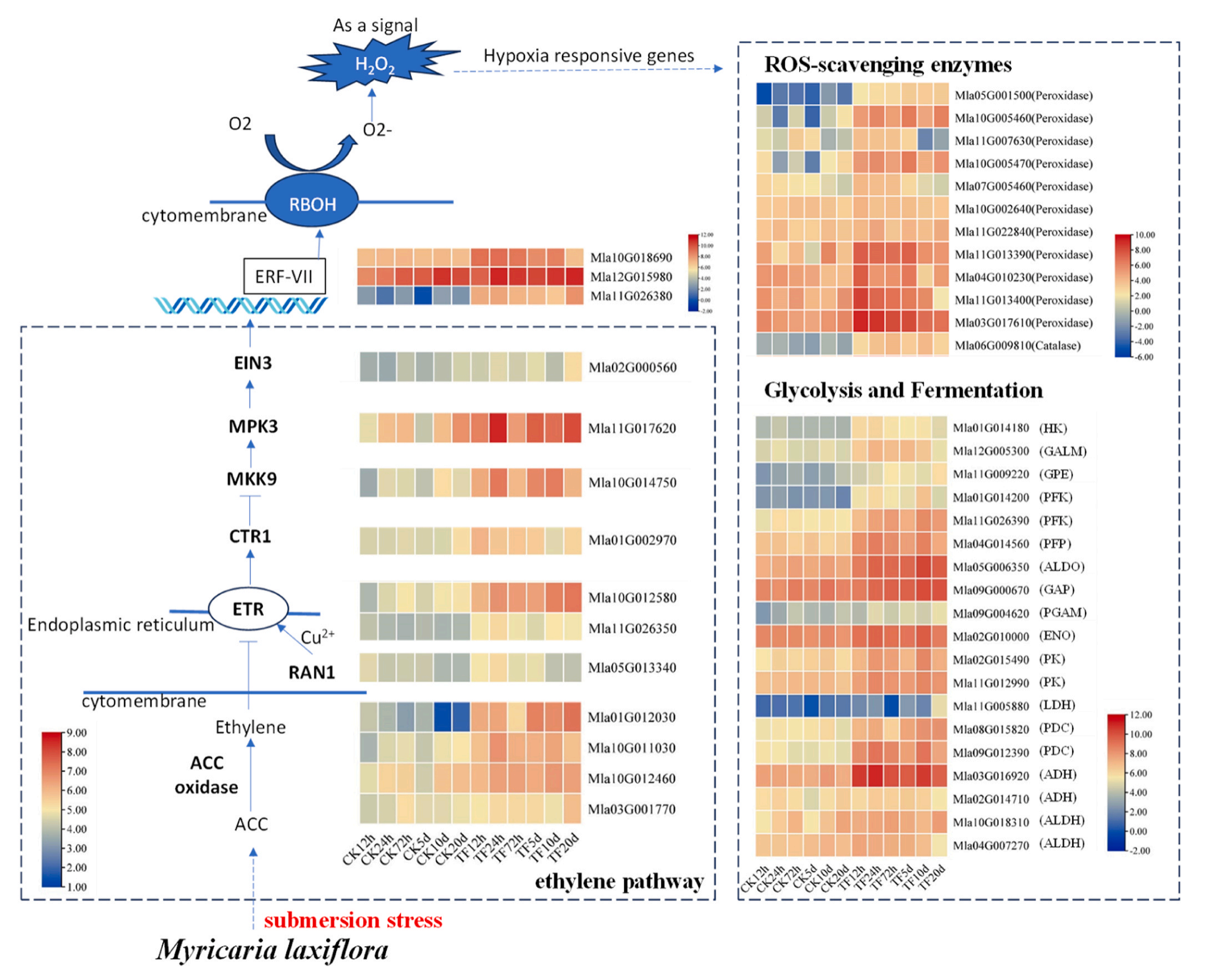 作者通過比較水淹和對照條件下疏花水柏枝形態(tài)、生理和轉錄組學的變化,分析了植物對水淹的適應機制。總體而言,在完全淹沒的狀態(tài)下,疏花水柏枝采用“靜止”的策略。具體來說,在淹水條件下,光合作用減弱,生長停滯,糖酵解被激活,抗氧化酶系統(tǒng)增強。乙烯反應途徑可能是這一過程的調控因子,MlERF-VII基因(Mla11G026380)可能是調控這一過程的關鍵基因。