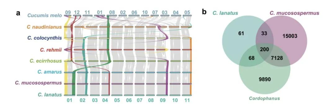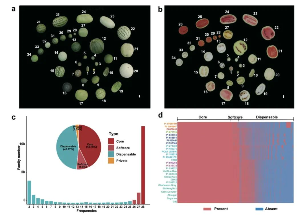 圖1-西瓜屬7個(gè)種的28份代表性材料的多樣性與泛基因組圖譜