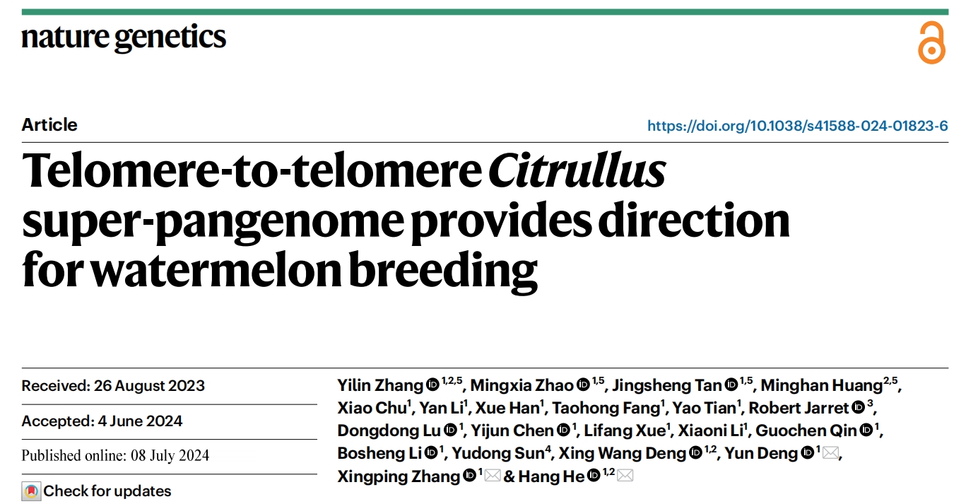 2024年7月8日,北京大學(xué)現(xiàn)代農(nóng)業(yè)研究院在國(guó)際頂尖期刊《自然-遺傳學(xué)》上在線發(fā)表了題為T(mén)elomere-to-telomere?Citrullus?Super-pangenome Provides Direction for Watermelon Breeding的研究成果,是西瓜科研領(lǐng)域的重大突破。