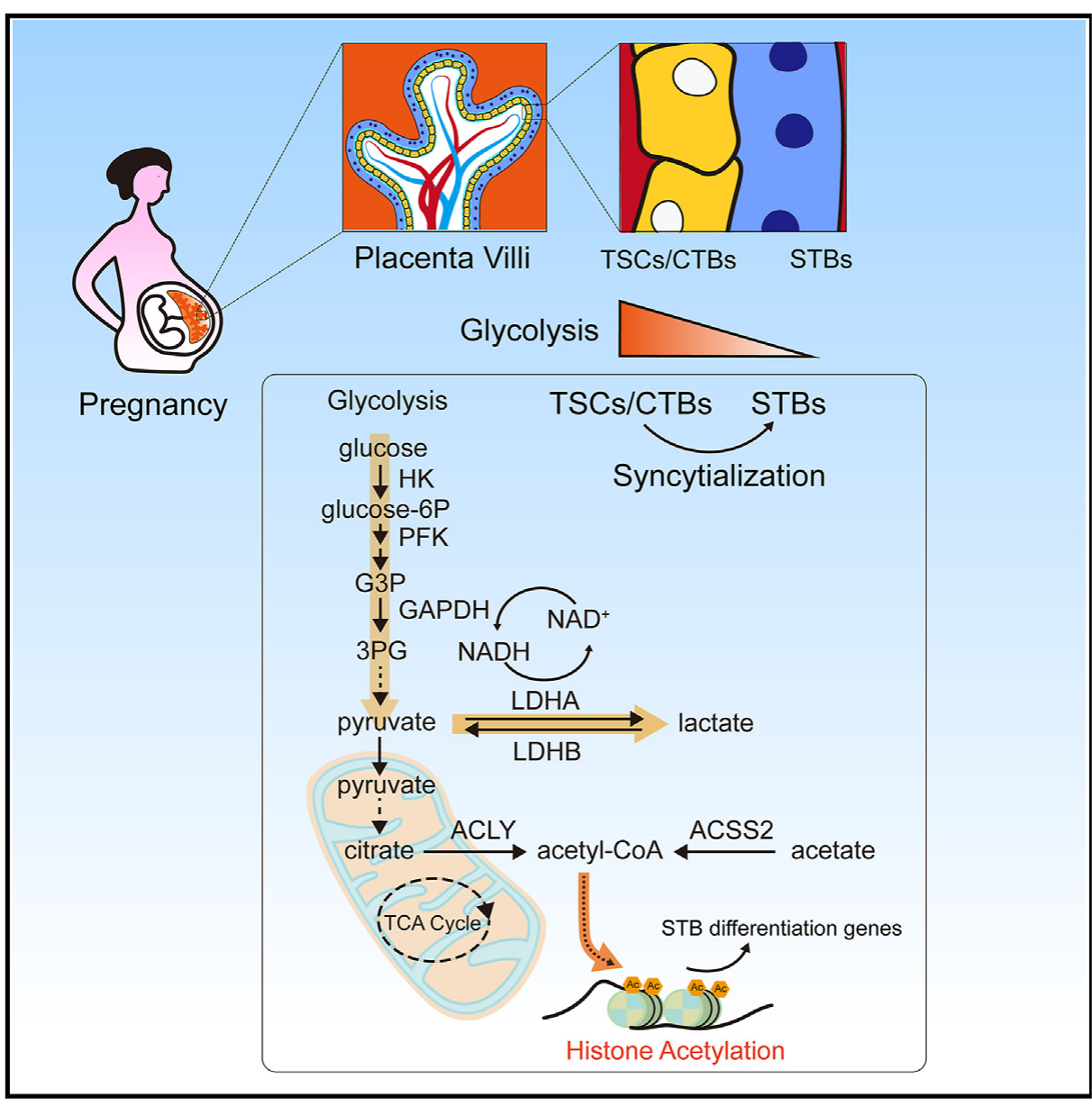 該研究通過代謝組學(xué)、轉(zhuǎn)錄組學(xué)、蛋白組學(xué)和表觀組學(xué)等技術(shù),使用人類妊娠早期胎盤樣本和人類滋養(yǎng)層干細(xì)胞(hTSCs)發(fā)現(xiàn),葡萄糖代謝在hTSCs和細(xì)胞滋養(yǎng)層細(xì)胞中高度活躍,但在合胞過程中,葡萄糖代謝降低到基礎(chǔ)水平,仍然是補(bǔ)充乙酰輔酶A和分化潛力所必需的。補(bǔ)充乙酸可以通過補(bǔ)充乙酰輔酶A和維持組蛋白乙?;瘉硗炀忍墙徒馊狈Φ暮习甜B(yǎng)細(xì)胞融合,從而挽救合胞基因的激活。即使是短暫的糖酵解缺乏也會永久性地抑制分化潛能和促進(jìn)炎癥,在體內(nèi)也可以通過短暫補(bǔ)充乙酸永久地挽救。這些結(jié)果表明,hTSCs在合胞過程中僅保留基礎(chǔ)糖酵解乙酰輔酶A代謝,通過營養(yǎng)反應(yīng)性組蛋白乙?;{(diào)節(jié)細(xì)胞命運,這對我們理解胎盤和胎兒營養(yǎng)之間的平衡具有重要意義。