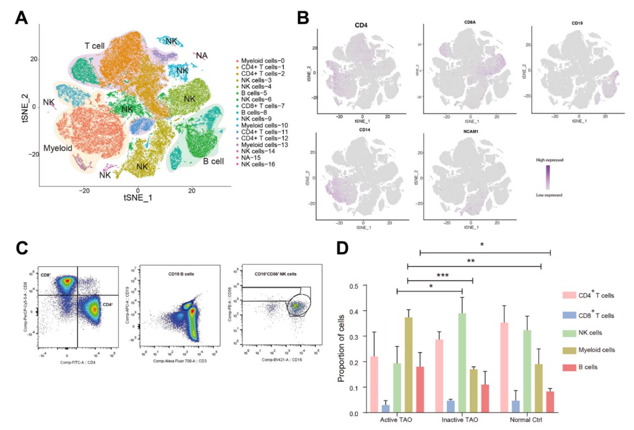 該研究使用10x Genomics Chromium平臺(tái)對(duì)總共9個(gè)樣本進(jìn)行了scRNA-seq。經(jīng)過(guò)初步質(zhì)量控制后,總共獲得了93,007個(gè)PBMC用于后續(xù)分析,其中包括來(lái)自活性TAO的23,051個(gè)細(xì)胞、來(lái)自非活性TAO的34797個(gè)細(xì)胞和來(lái)自正常對(duì)照 (NC) 的35,159個(gè)細(xì)胞?;趫D的聚類(lèi)分析確定了17個(gè)不同的聚類(lèi)。在手動(dòng)確認(rèn)細(xì)胞類(lèi)型注釋后,該研究成功將簇分為五種主要的PBMC細(xì)胞類(lèi)型。其中包括各種CD4+ T細(xì)胞群 (CD4+)、NK (CD56+)、CD8+T細(xì)胞 (CD8A+)、B細(xì)胞 (CD19+) 和骨髓細(xì)胞 (CD11b+)(圖1A,1B)。通過(guò)流式細(xì)胞術(shù)分析驗(yàn)證了scRNA-seq鑒定的這五種細(xì)胞類(lèi)型的存在(圖1C)。值得注意的是,17個(gè)細(xì)胞簇中的12個(gè) (70.6%) 包含來(lái)自多個(gè)單獨(dú)樣本的至少100個(gè)細(xì)胞,每個(gè)簇內(nèi)平均有9個(gè)單獨(dú)樣本。