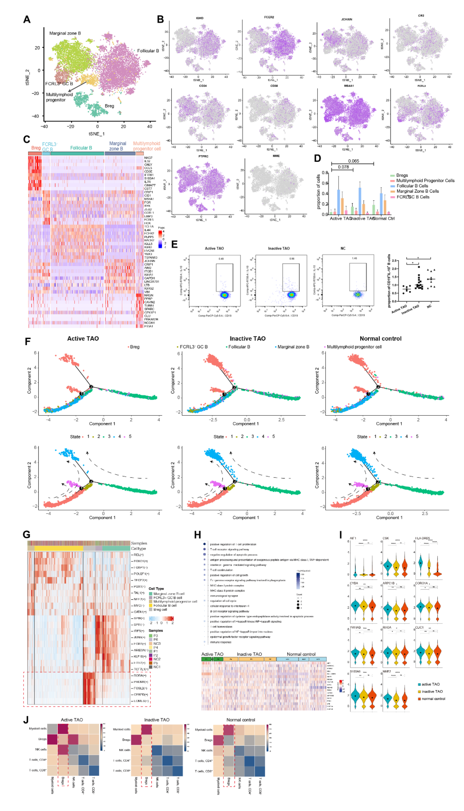 進(jìn)行軌跡分析以闡明不同B細(xì)胞亞群之間的動(dòng)態(tài)關(guān)系。分析發(fā)現(xiàn)了3個(gè)分支點(diǎn)和5 個(gè)不同的狀態(tài)。狀態(tài)1的特征是邊緣區(qū)B細(xì)胞和FCRL3高GC B細(xì)胞同時(shí)分布。狀態(tài) 2由一小部分濾泡B細(xì)胞組成。狀態(tài)3主要由濾泡B細(xì)胞組成。狀態(tài)4和狀態(tài)5主要由 Breg組成。此外,所有狀態(tài)都表現(xiàn)出彌散的多淋巴細(xì)胞祖細(xì)胞(圖2F)。與之前的發(fā)現(xiàn)一致,該研究觀察到活性TAO中處于狀態(tài)4和狀態(tài)5的Bregs細(xì)胞密度降低。根據(jù)SCENIC分析,發(fā)現(xiàn)一組受不同轉(zhuǎn)錄因子調(diào)控的獨(dú)特基因在Bregs中特異性表達(dá),而在其他細(xì)胞類(lèi)型中幾乎不存在(圖2G)。在Bregs中,受RORA、CEBPD、PRDM1、FOSL2和EOMES調(diào)控的基因顯示出明顯更高的表達(dá)水平。