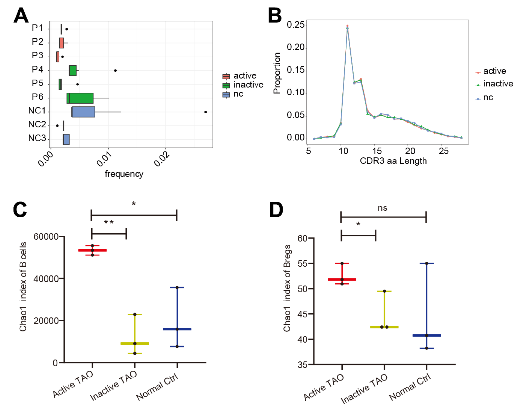 為了全面分析B細(xì)胞群中的基因表達(dá)和BCR多樣性,該研究對(duì)scRNA-seq分析中使用的PBMC樣本進(jìn)行了scBCR-seq。在活性TAO中,前10個(gè)克隆型的比例(0.17%)與非活性組(0.37%,p=0.010)和NC組(0.41%,p=9.31E-05)(圖3A)。然而,對(duì)互補(bǔ)決定區(qū)3 (CDR3) 長(zhǎng)度的分析沒(méi)有顯示任何明顯的變化(圖3B)。當(dāng)檢查CDR3的多樣性時(shí),通過(guò)Chao1指數(shù)量化,與NC組 (p=0.016) 和非活動(dòng)TAO組 (p=0.002) (圖3C)。Breg細(xì)胞中也出現(xiàn)了類(lèi)似的趨勢(shì)(圖 3D),與NC組相比顯著增加(p=0.011),但活性TAO之間沒(méi)有統(tǒng)計(jì)學(xué)顯著差異組和NC組 (p=0.213)。這些發(fā)現(xiàn)表明,雖然活性TAO中前10個(gè)克隆型的頻率降低,但在這種情況下CDR3序列的多樣性增加,這可能對(duì)免疫反應(yīng)的調(diào)節(jié)有影響,并有助于活性TAO的發(fā)病機(jī)制。