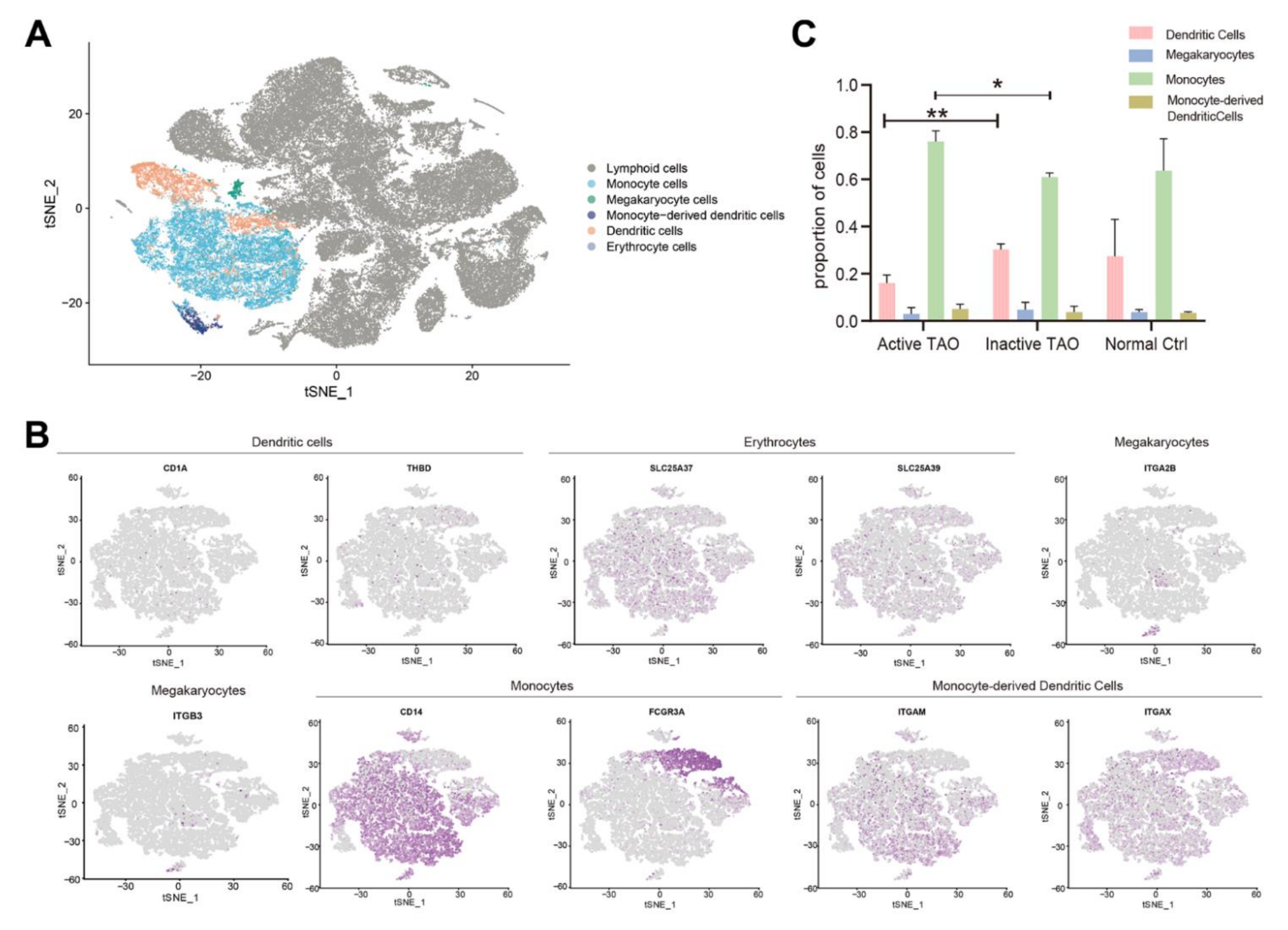 為了評(píng)估骨髓細(xì)胞在TAO中的參與情況,該研究鑒定了骨髓細(xì)胞的主要亞型,并檢查了它們?cè)诨钚訲AO中的配置。分析顯示了五種不同的骨髓細(xì)胞群,即單核細(xì)胞、巨核細(xì)胞、樹(shù)突狀細(xì)胞 (DC)、單核細(xì)胞衍生的DC和紅細(xì)胞(圖4A )。這些細(xì)胞類(lèi)型的鑒定基于差異基因表達(dá)和對(duì)已建立的譜系標(biāo)記的檢查(圖4B)?;钚訲AO 和非活性TAO之間的比較揭示了單核細(xì)胞和DC比例的顯著差異。與非活動(dòng)TAO組相比,活動(dòng)TAO患者的單核細(xì)胞比例顯著較高 (p=0.006),而活動(dòng)TAO中DC的比例顯著較低 (p= 0.003) (圖4C)。這些發(fā)現(xiàn)表明,單核細(xì)胞水平增加和DC數(shù)量減少可能是TAO患者活動(dòng)性疾病狀態(tài)的特征。